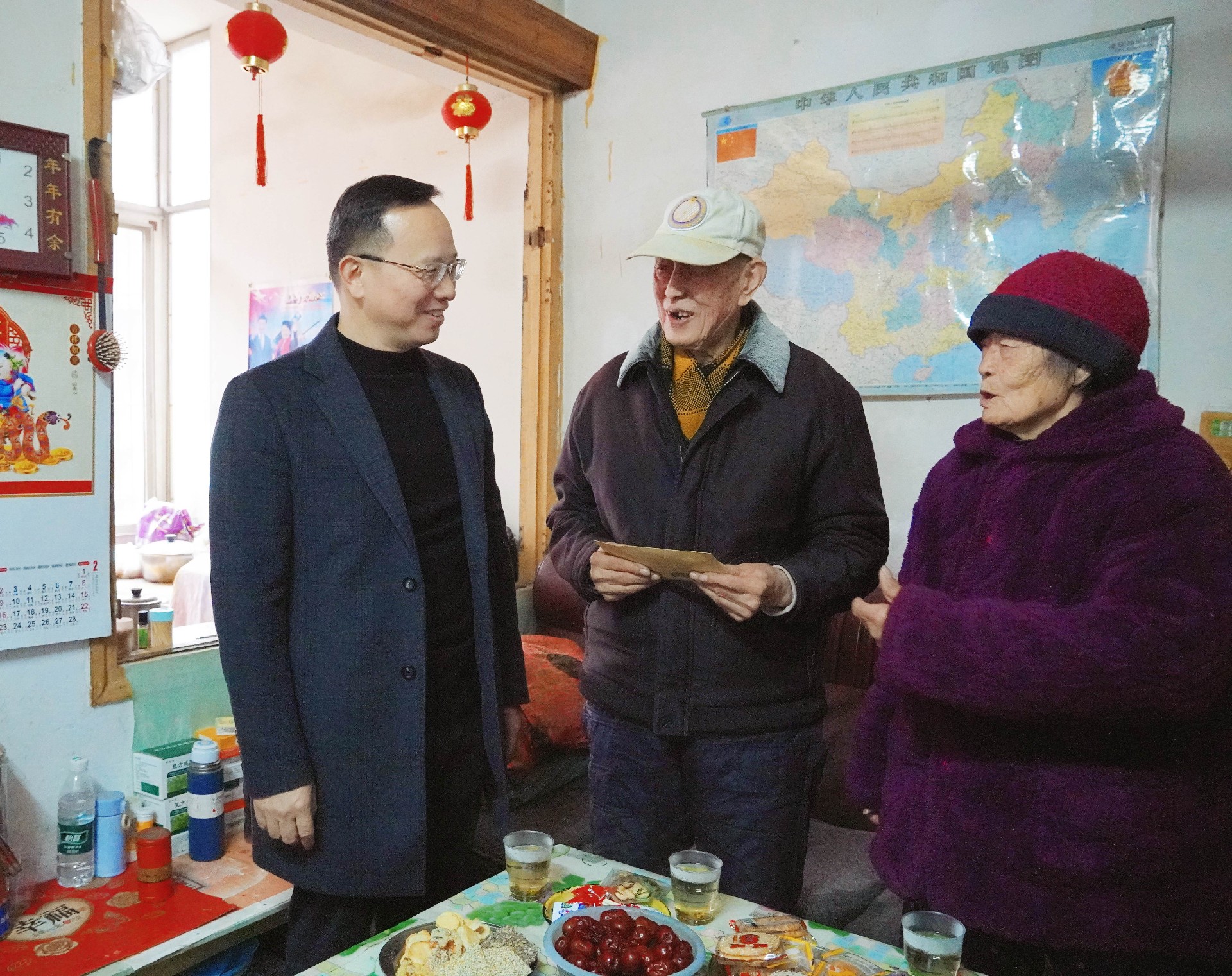 在衡阳地信所光明基地,谈文胜的一句“老前辈,新年好!春节快到了,我们来看您啦!”瞬间拉近了与中华人民共和国成立前参加工作的老工人李福柱的距离。李福柱老人紧紧握住他的手,激动之情溢于言表。谈文胜关切地询问老人的身体、生活状况及困难,叮嘱他和家人保重身体,保持乐观心态。同时,谈文胜向李老简要介绍了湖南地质改革发展的成果,对他为湖南地质事业的奉献致以诚挚谢意。李福柱老人深情回忆起1949年8月在延安高级法院参加革命后的戎马生涯,跟随部队辗转南北,投身戈壁沙漠,参与新中国核事业建设,自豪之情溢于言表。他对地质院党委的关怀关爱感恩不已。