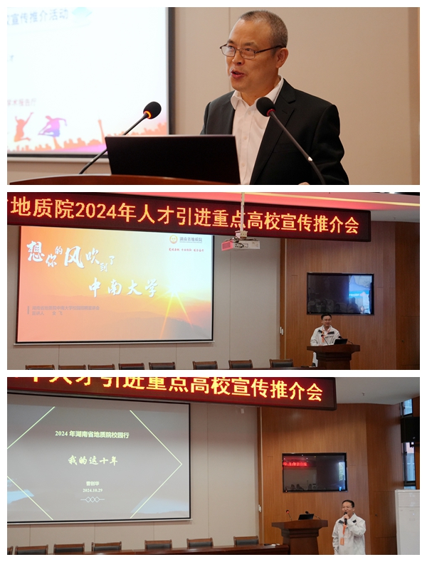 省地质院党委书记谈文胜,中南大学党委副书记、纪委书记彭立威,党委常委、副校长郭学益,院领导王惜珍、曹幼元、李晴日,中南大学地球科学与信息物理学院、研究生院相关负责人参加活动,院党委委员、副院长刘凤娟主持宣传推介会。
